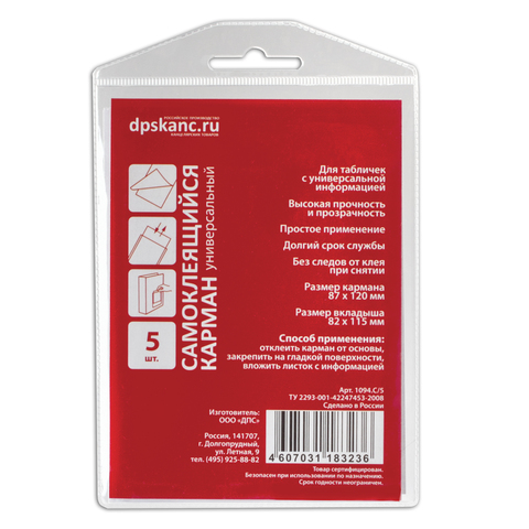 Карманы самоклеящиеся на любую поверхность (88х119 мм), КОМПЛЕКТ 5 шт., ДПС, 1094.C/5