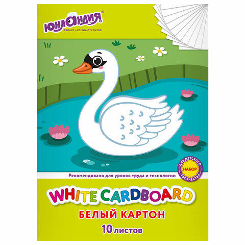 Картон белый А4 немелованный, 10 листов, в папке, ЮНЛАНДИЯ, 200х290 мм, "Лебедь", 115639