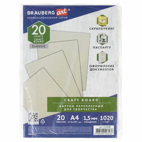 Картон переплетный, толщина 1,5 мм, А4 (210х297 мм), КОМПЛЕКТ 20 шт., BRAUBERG ART, 115340