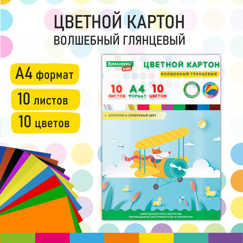 Картон цветной А4 МЕЛОВАННЫЙ ВОЛШЕБНЫЙ, 10 листов, 10 цветов, в папке, BRAUBERG KIDS, 200х290 мм, "Лисенок-пилот", 115157