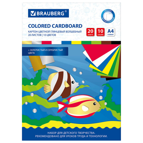 Картон цветной А4 МЕЛОВАННЫЙ ВОЛШЕБНЫЙ, 20 листов, 10 цветов, в папке, BRAUBERG, 200х290 мм, 113546
