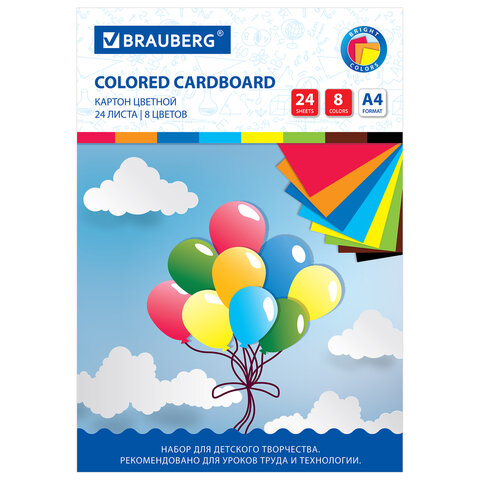 Картон цветной А4 немелованный, 24 листа 8 цветов, в папке, BRAUBERG, 200х290 мм, "Шарики", 113558