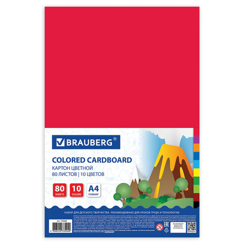 Картон цветной А4 немелованный, 80 листов, 10 цветов, в коробке, BRAUBERG, 200х290 мм, 113560
