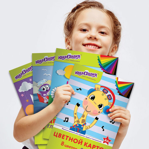 Картон цветной А4 немелованный (матовый), 8 листов 8 цветов, в папке, ЮНЛАНДИЯ, 200х290 мм, "ВЕСЕЛЫЙ ЖИРАФИК", 129568