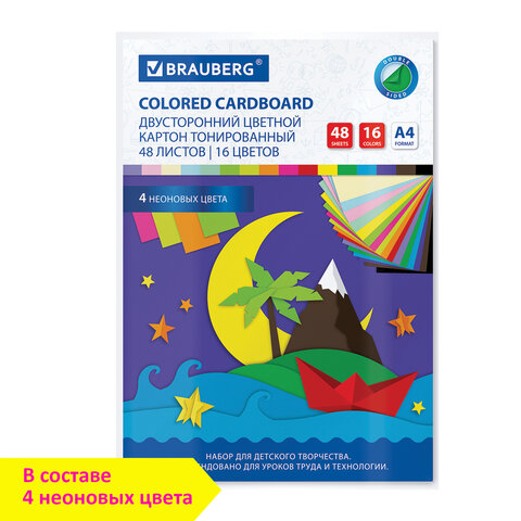 Картон цветной А4 ТОНИРОВАННЫЙ В МАССЕ, 48 листов 16 цветов (+ неон), склейка, 180 г/м2, BRAUBERG, 113507