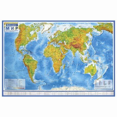 На географической карте мира BRAUBERG отображаются названия континентов, океанов и морей, рек, гор, течений.