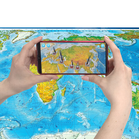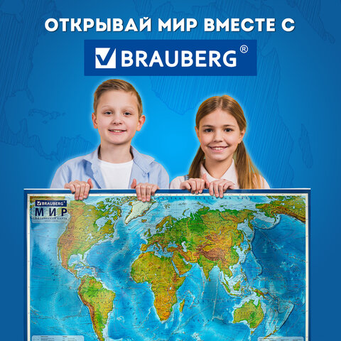 Карта мира физическая 199х134 см, 1:15,5М, с ламинацией, интерактивная, в тубусе, BRAUBERG, 112389