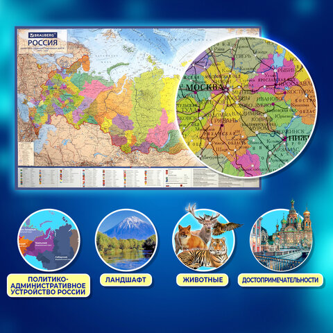 На политико-административной карте России BRAUBERG отображается современное политико-административное устройство Российской Федерации: названия регионов, их границы, административные центры, крупнейшие географические объекты и т. д.