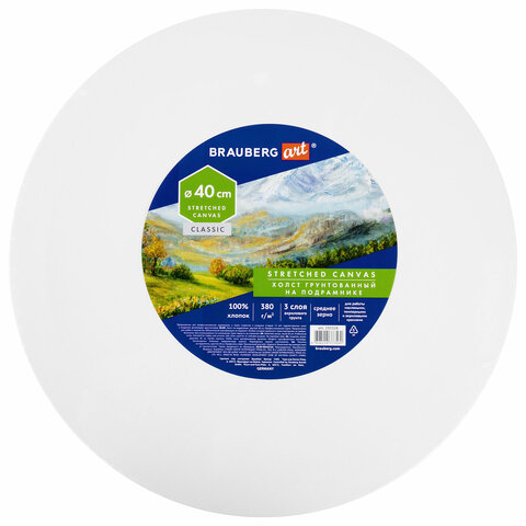 Холст на подрамнике, круглый 40 см, грунтованный, 380 г/м2, 100% хлопок, BRAUBERG ART CLASSIC, 192328