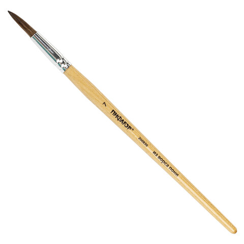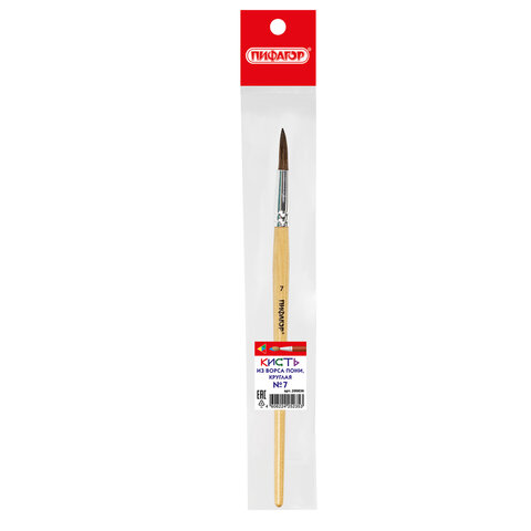 Кисть ПИФАГОР, ПОНИ, круглая, № 7, деревянная лакированная ручка, колпачок, пакет с подвесом, 200836