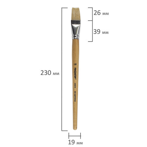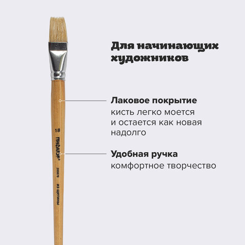 Кисть ПИФАГОР, ЩЕТИНА, плоская, № 18, деревянная лакированная ручка, пакет с подвесом, 200878