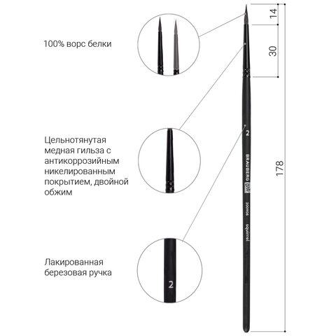 Кисть художественная проф. BRAUBERG ART CLASSIC, белка, круглая, № 2, 200908