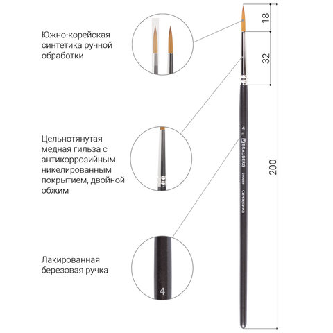 Художественная профессиональная синтетическая кисть BRAUBERG ART "CLASSIC" № 4 предназначена для работы с акварелью, с масляными красками и другими материалами для живописи.