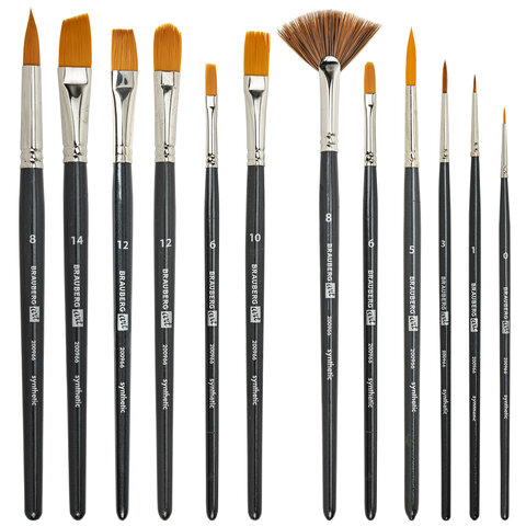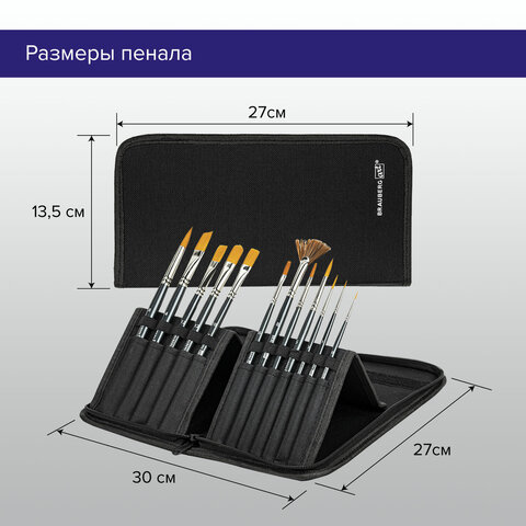 Кисти художественные набор 12 шт. в черном пенале, синтетика, BRAUBERG ART CLASSIC, № 0-14 + веерная, 200966
