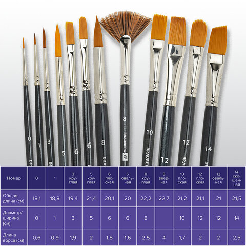 Номер кисти круглая № 0, 1, 3, 5, 8; плоская № 6, 10, 12; скошенная № 14; овальная № 6, 12; веерная № 8