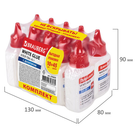 Клей ПВА КОМПЛЕКТ 10 штук х 45 г (бумага, картон, дерево), ВЫГОДНАЯ УПАКОВКА, BRAUBERG, 270433, 93
