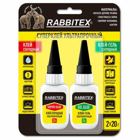 Клей-гель + суперклей секундный УЛЬТРАПРОЧНЫЙ, МАКСИМАЛЬНЫЙ ОБЪЕМ, набор 2х20 г, RABBITEX (РАББИТЕКС) "ДВА СЛОНА", 609806