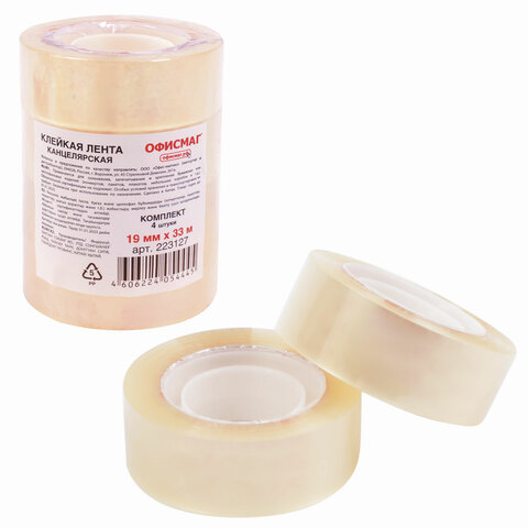 Клейкие ленты 19 мм х 33 м канцелярские ОФИСМАГ, комплект 4 шт., прозрачные, гарантированная длина, 223127