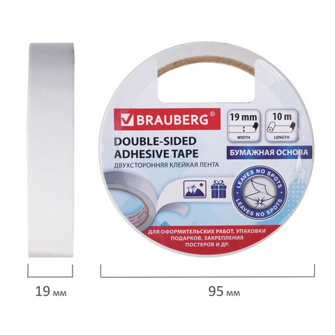 Двухсторонняя клейкая лента BRAUBERG на бумажной основе применяется для работ с оформлением, упаковки подарков, детского творчества, закрепления постеров.