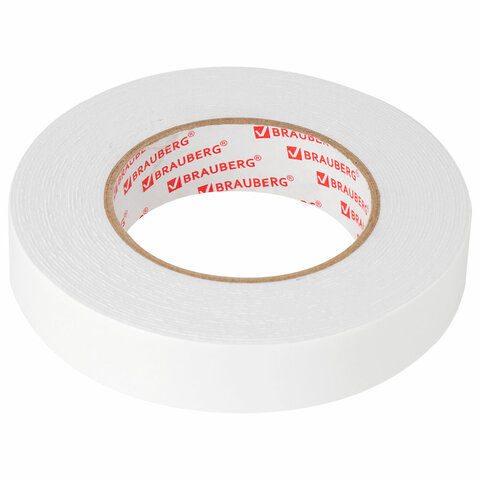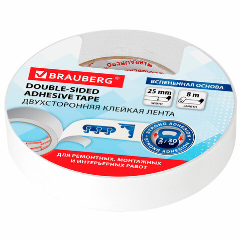 Клейкая двухсторонняя лента 25 мм х 8 м, НА ВСПЕНЕННОЙ ОСНОВЕ, 1 мм, прочная, BRAUBERG, 600487