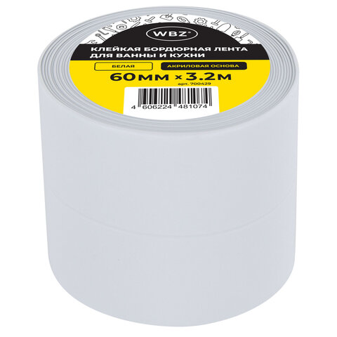 Клейкая лента бордюрная для ванны и кухни 60 мм х 3,2 м, белая, акриловая основа, WBZ (ВБЗ), 700429