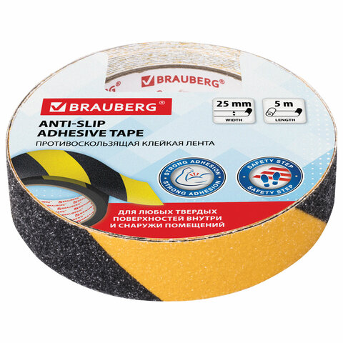 Клейкая ПРОТИВОСКОЛЬЗЯЩАЯ зернистая лента BRAUBERG предназначена для предотвращения ситуаций, связанных с несчастными случаями из-за проскальзывания на любых твердых поверхностях внутри и снаружи помещений.