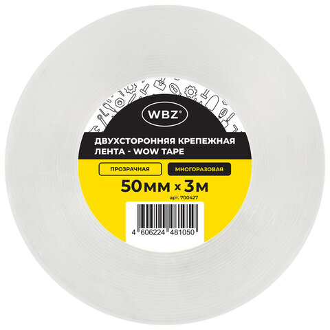 Многоразовая двухсторонняя прозрачная крепежная лента, скотч NANO tape, 3 м x 5 см, толщина 1 мм, WBZ (ВБЗ), 700427