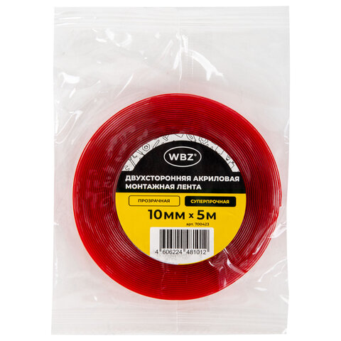 Монтажная прозрачная суперпрочная двухсторонняя лента 10 мм х 5 м, акриловая, толщина 1 мм, WBZ (ВБЗ), 700423