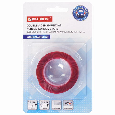 Монтажная прозрачная суперпрочная двухсторонняя лента 19 мм х 1,5 м, акриловая, 1 мм, BRAUBERG, 606423