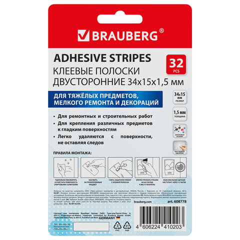 Клеевые полоски двусторонние, 34х15 мм, акриловая основа, 32 шт., BRAUBERG, 608778