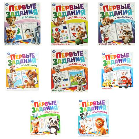 Книжки-пособия серии "ПЕРВЫЕ ЗАДАНИЯ МАЛЫШАМ" помогают ребенку познакомиться с названиями цветов, разными видами транспорта, цифрами, формами и другими понятиями.