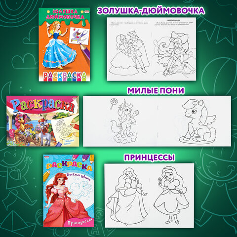 В наборе книжек-раскрасок формата А5 "ДЛЯ ДЕВОЧЕК И МАЛЬЧИКОВ" представлено много интересных и увлекательных сюжетов. Дайте малышу цветные карандаши, краски или фломастеры, и он с удовольствием и пользой проведёт время!