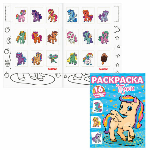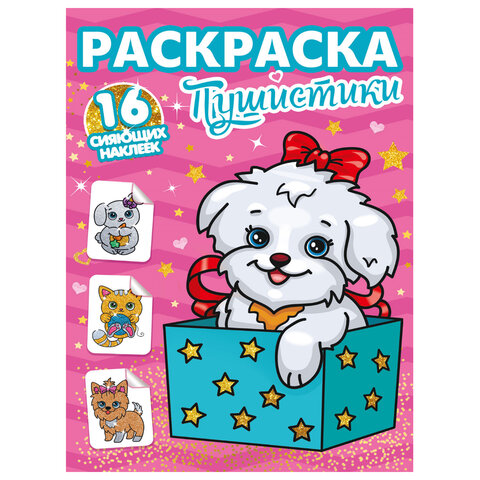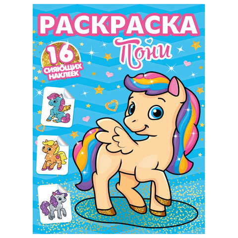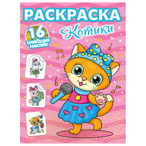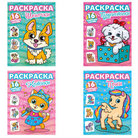 Книжка-раскраска С СИЯЮЩИМИ НАКЛЕЙКАМИ, АССОРТИ дизайнов, 195х276 мм, 16 стр., ПП