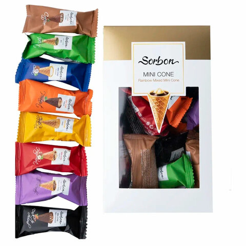 Мини-рожки SORBON "Ассорти Радуга" – это хрустящие вафельные рожки и нежные начинки: кофе, мята, кокос, арахис, сохан, фундук, стреляющая карамель, миндаль. Представлены в эстетичной подарочной упаковке.