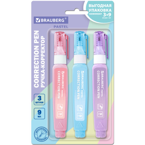 Ручка-корректор 9 мл, ВЫГОДНАЯ УПАКОВКА, КОМПЛЕКТ 3 штуки, BRAUBERG PASTEL, 274237