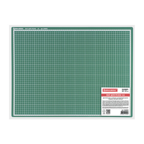 Коврик (мат) для резки BRAUBERG, 3-слойный, А2 (600х450 мм), двусторонний, толщина 3 мм, зеленый, 236903