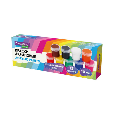 Краски акриловые для рисования и творчества 12 цветов по 10 мл, BRAUBERG HOBBY, 192433