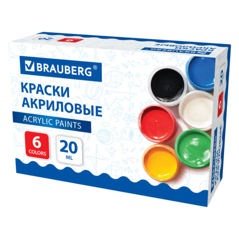 Краски акриловые для рисования и творчества 6 цветов по 20 мл, BRAUBERG, 192562