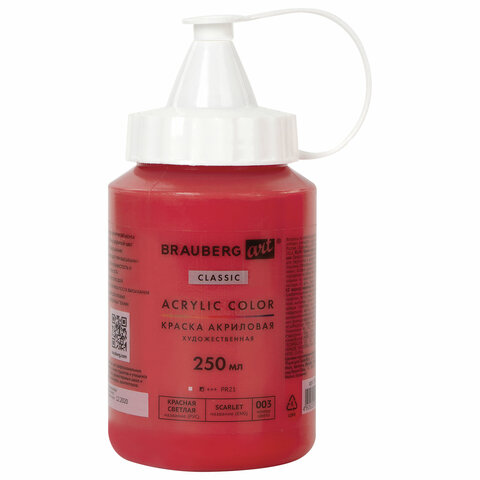 Краска акриловая художественная BRAUBERG ART CLASSIC, флакон 250 мл, КРАСНАЯ СВЕТЛАЯ, 191707