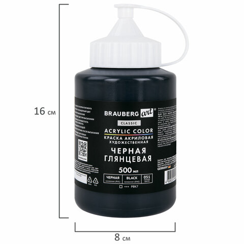 Краска акриловая художественная ГЛЯНЦЕВАЯ черная 500 мл в банке, BRAUBERG ART CLASSIC, 192540