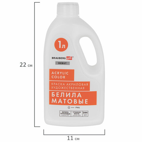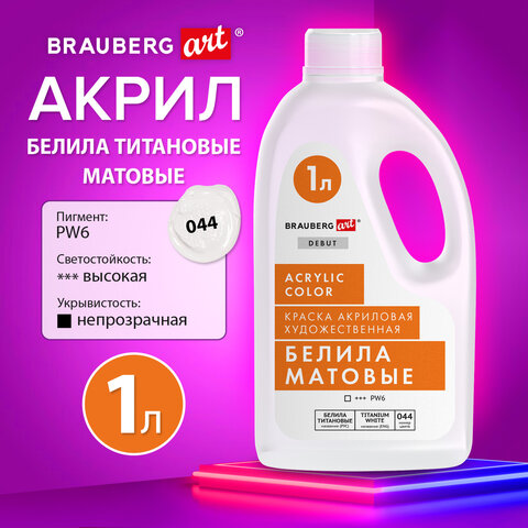 Краска акриловая художественная МАТОВАЯ 1000 мл бутыль, белила титановые, BRAUBERG ART DEBUT, 192537