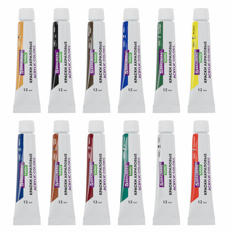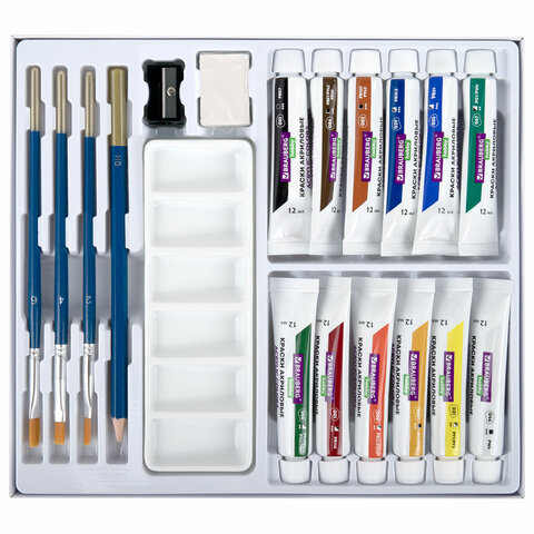 Краски акриловые художественные 12 цветов в тубах по 12 мл, кисти 3 шт., палитра, аксессуары, 19 предметов, BRAUBERG HOBBY, 192543