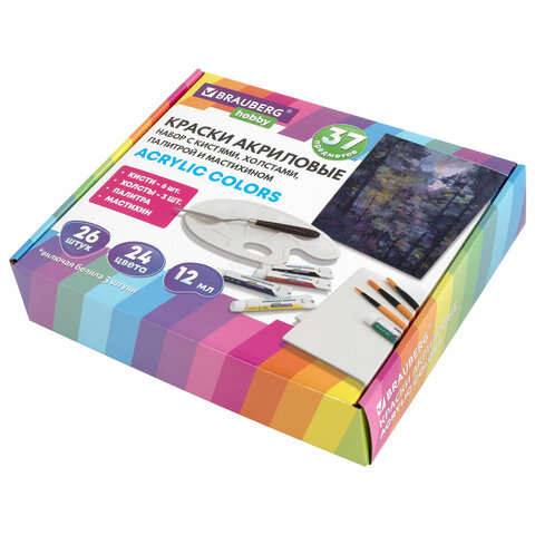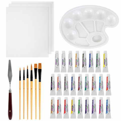 Краски акриловые художественные 26 шт. по 12 мл, холсты 3 шт., кисти 6 шт., аксессуары, 37 предметов, BRAUBERG HOBBY, 192544