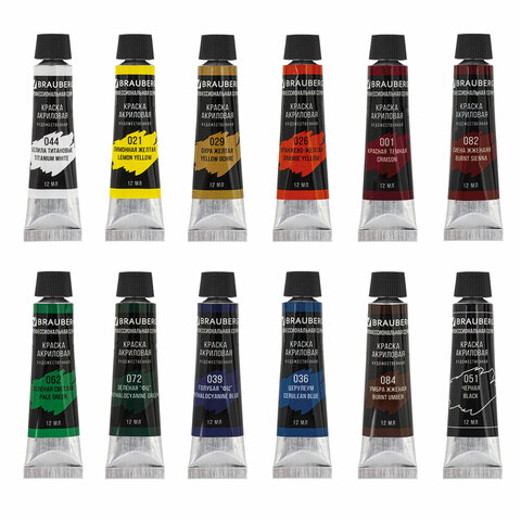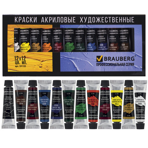 Краски акриловые художественные BRAUBERG ART CLASSIC, НАБОР 12 цветов по 12 мл, в тубах, 191122