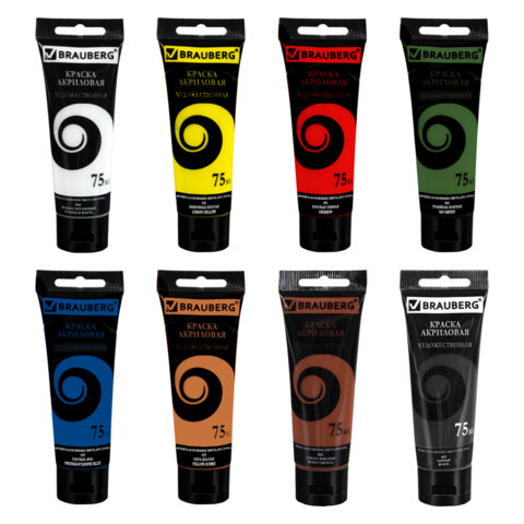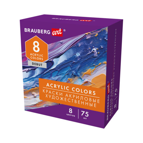 Краски акриловые художественные матовые 8 цветов в тубах по 75 мл, BRAUBERG ART DEBUT, 192418
