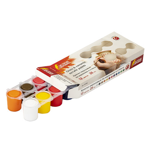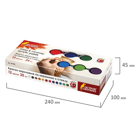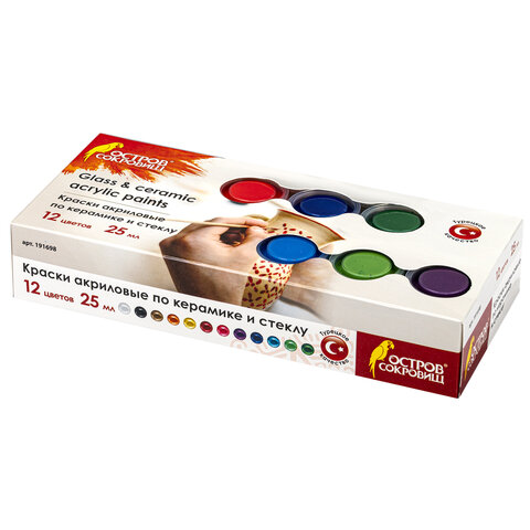 Краски акриловые по керамике и стеклу ОСТРОВ СОКРОВИЩ 12 цветов по 25 мл, 191698