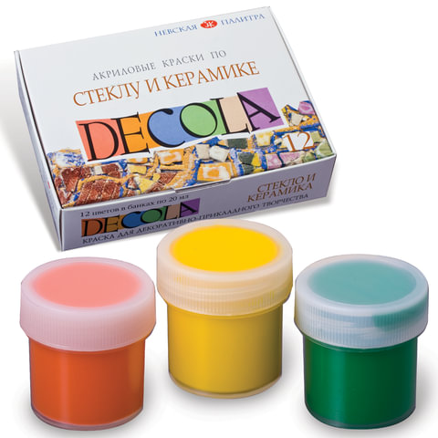 Краски акриловые по стеклу и керамике "Декола", 12 цветов по 20 мл, в баночках, Невская Палитра, 4041114
