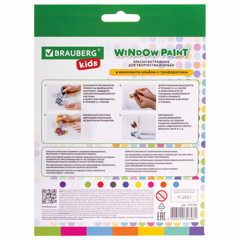 Витражные краски BRAUBERG KIDS предназначены для украшения окон, зеркал и других гладких поверхностей яркими аппликациями. Могут быть использованы для декорирования и росписи изделий, изготовления наклеек.