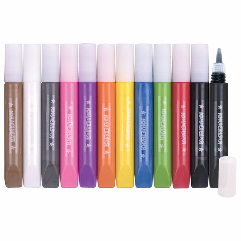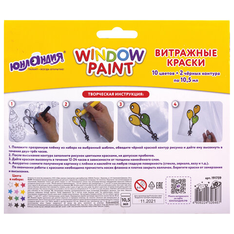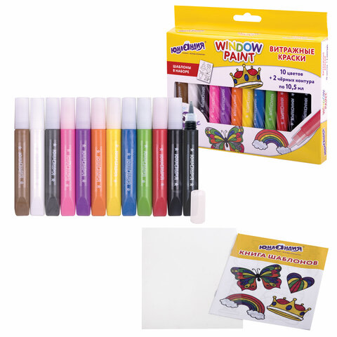 Краски витражные ЮНЛАНДИЯ, 10 цветов + 2 черных контура, 12 туб по 10,5 мл, книга шаблонов, 191759