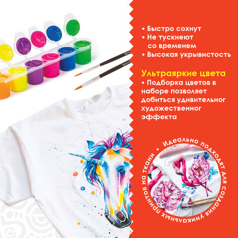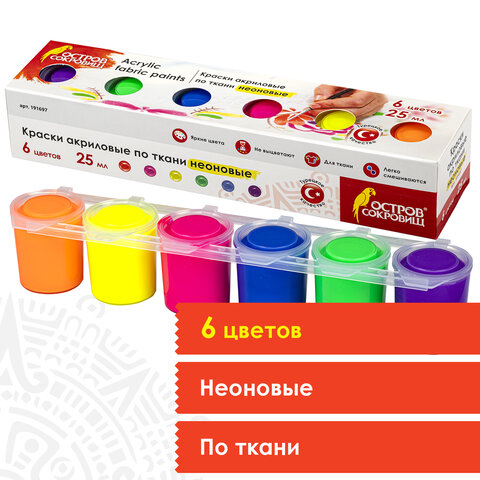 Краски акриловые по ткани НЕОН ОСТРОВ СОКРОВИЩ 6 цветов по 25 мл, 191697